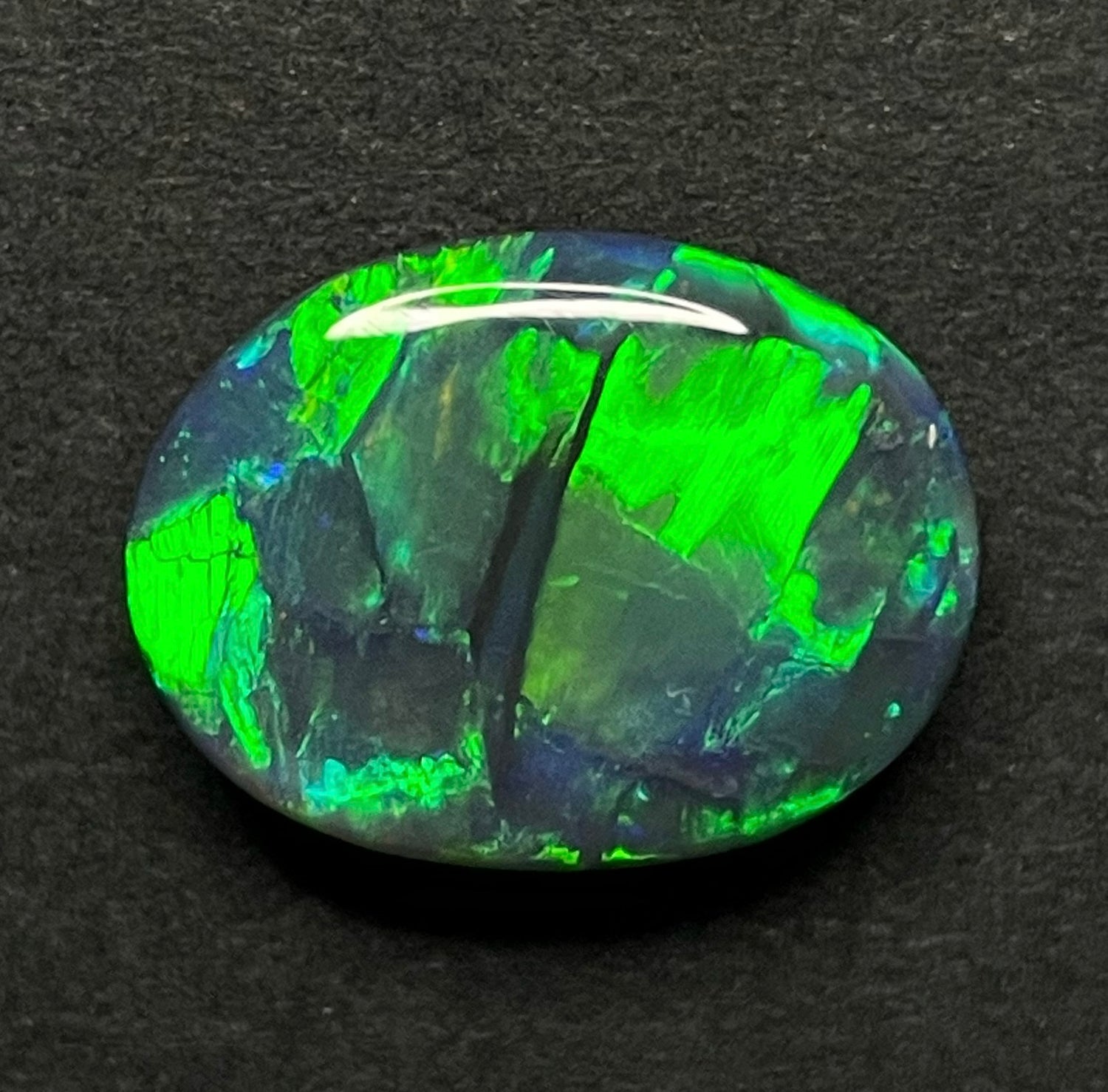 Opal doublets are a slice of crystal or light opal assembled to a black backing which imitates a natural black opal. This type of opal has a fabulous bright and vivid look without the black opal price tag.