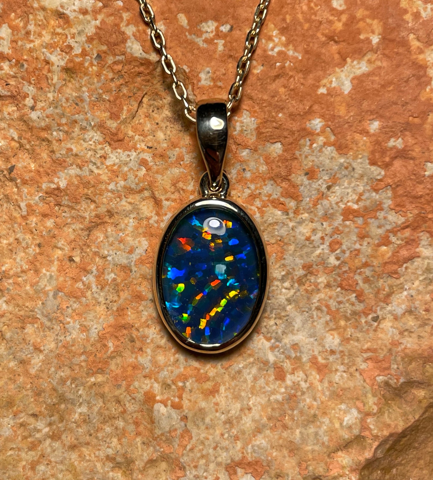 Opal triplets are a slice of crystal opal assembled to a black glass backing with a crystal quartz or moulded glass capping which imitates a natural black opal. This type of opal has a fabulous bright and vivid look without the black opal price tag. My family have been producing triplets for over 50 years - nothing is sent overseas to be cut.