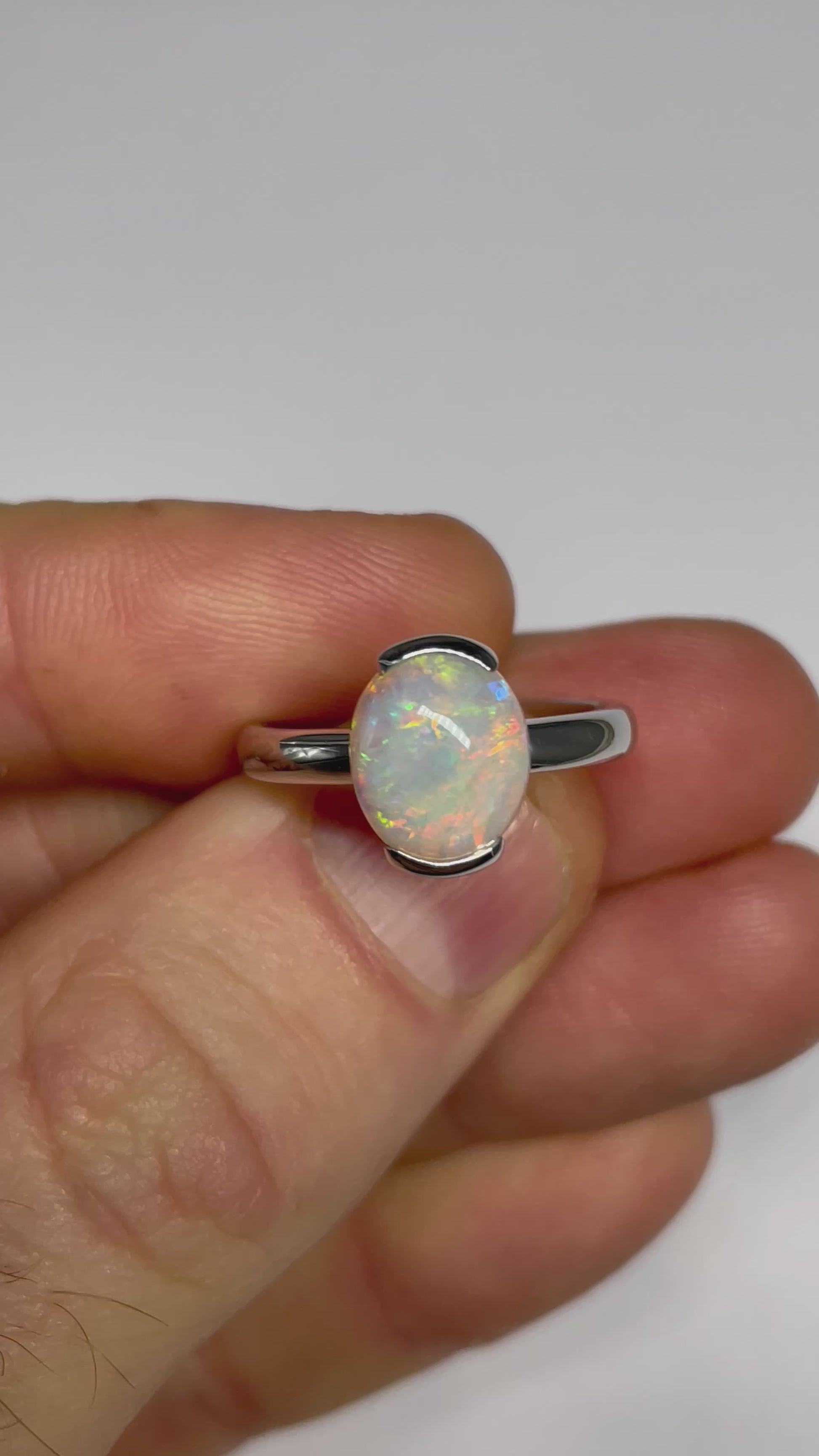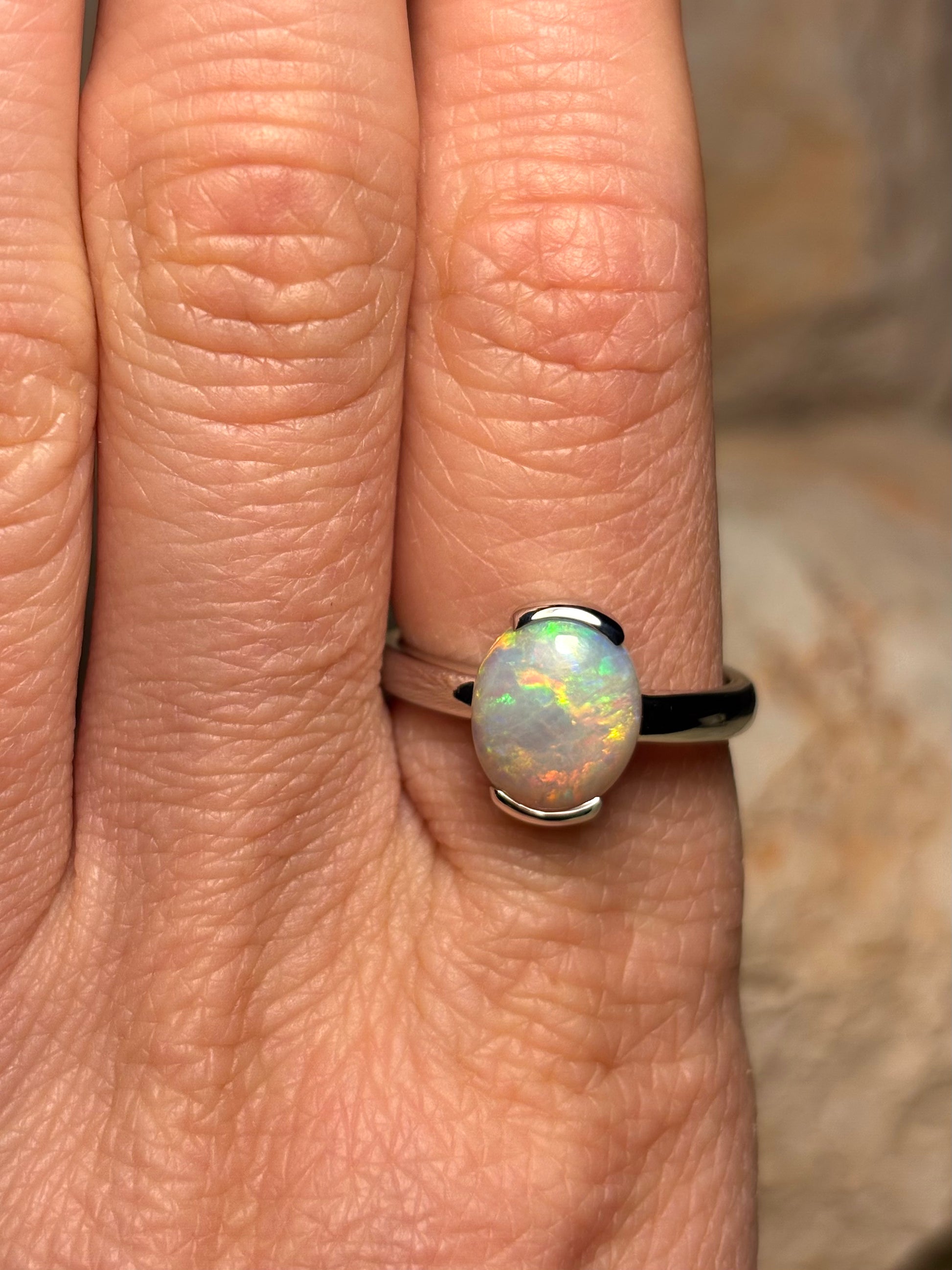 This sterling silver ring features a beautiful white opal with colours of orange, pink, yellow and green. Opal reminds us of the stunning views of the painted desert not far from Coober Pedy.