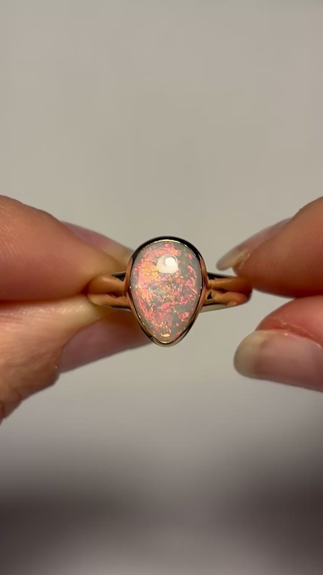 This 9k gold bezel ring features a beautiful white opal that features colours dominant of pink, and orange in one light, yet green flashes in another. Opal has a lovely speckled pattern throughout.