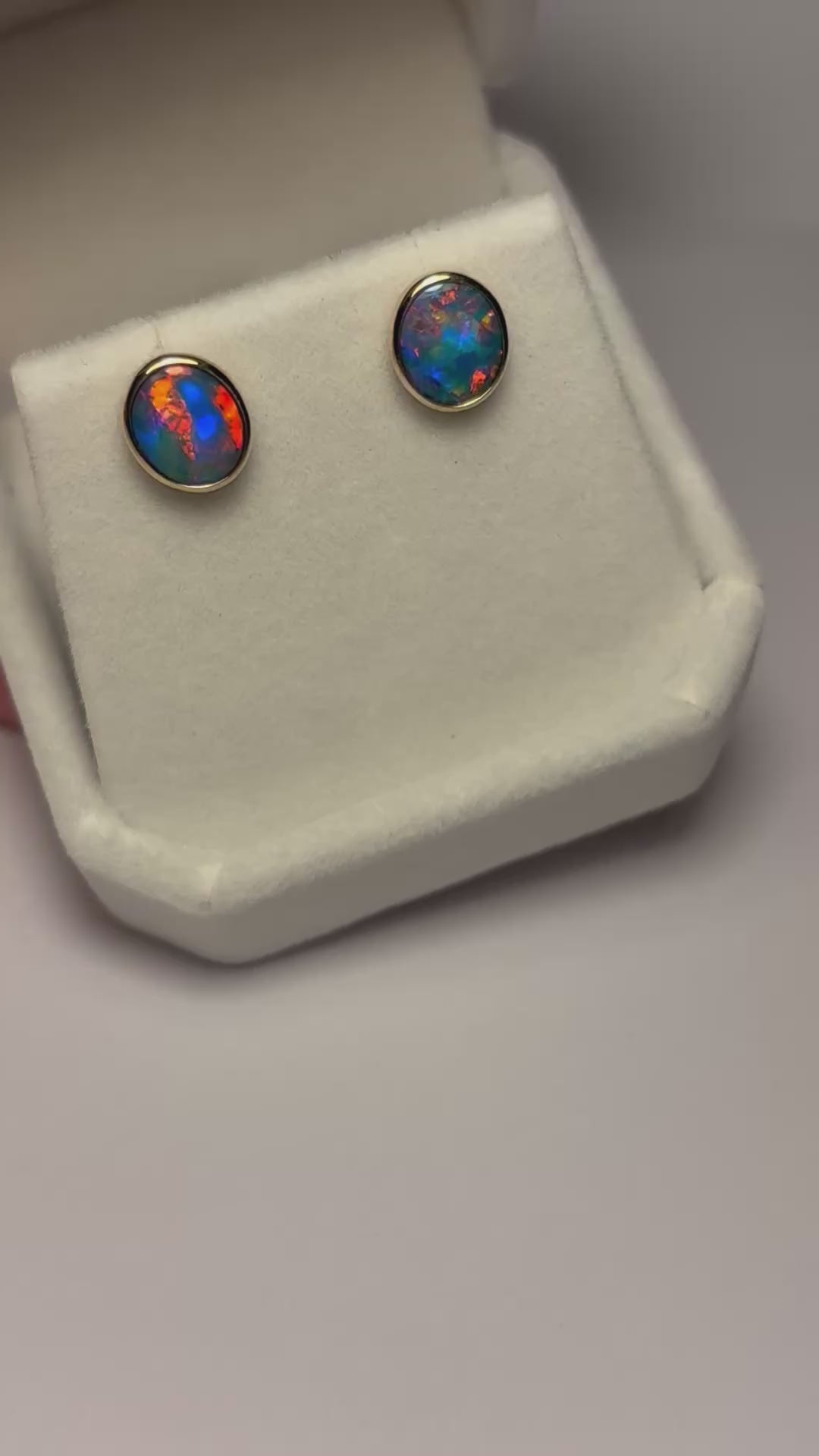These 9k gold stud earrings feature beautiful Australian doublet opal with vibrant colours of pink, blue and green. Doublets have a lovely striation pattern throughout.
