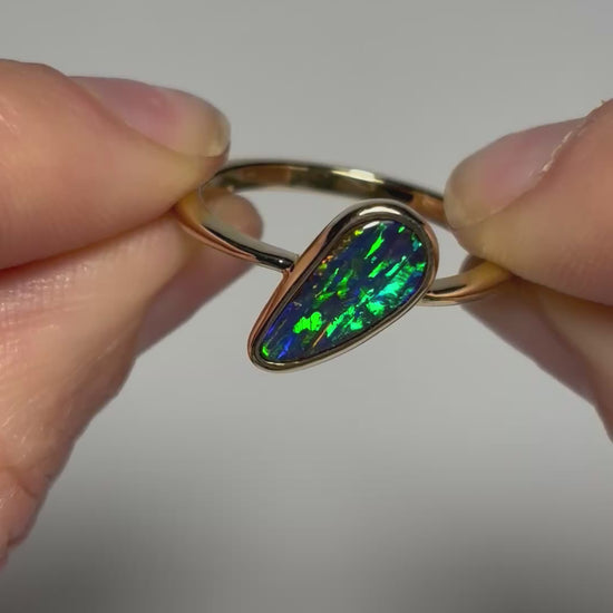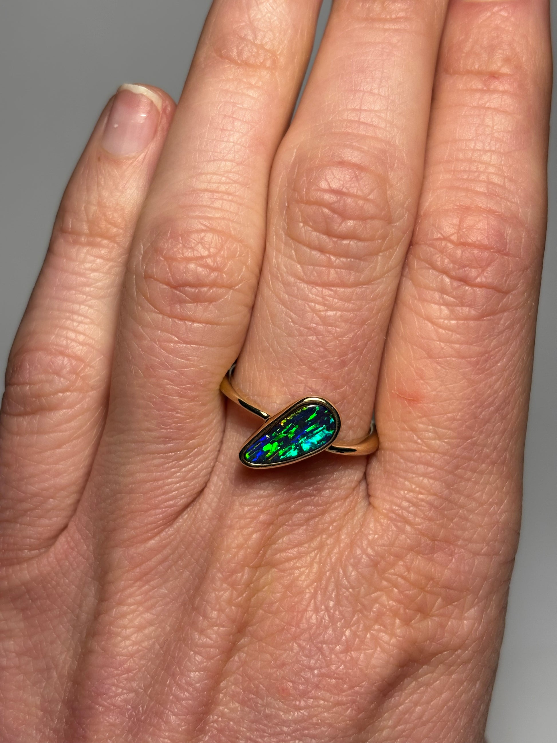This 14k gold bezel ring features a beautiful boulder opal with deep, dark colours of blue/green/gold and lovely striations of colour.