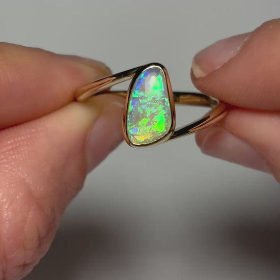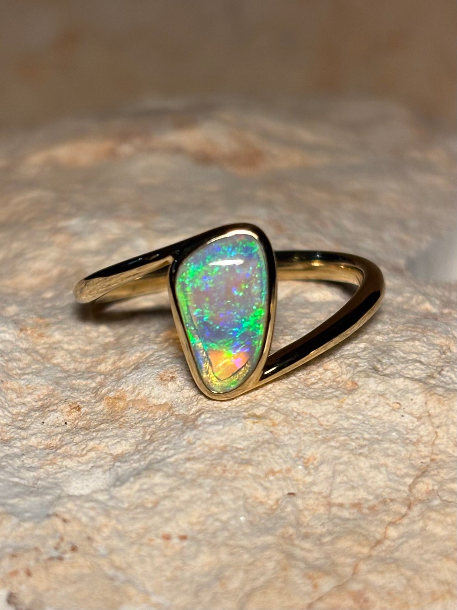 This 14k gold bezel ring features a beautiful vibrant opal with colours of green, blue, and gold. Opal is very bright and would be perfect for any ocean lover.