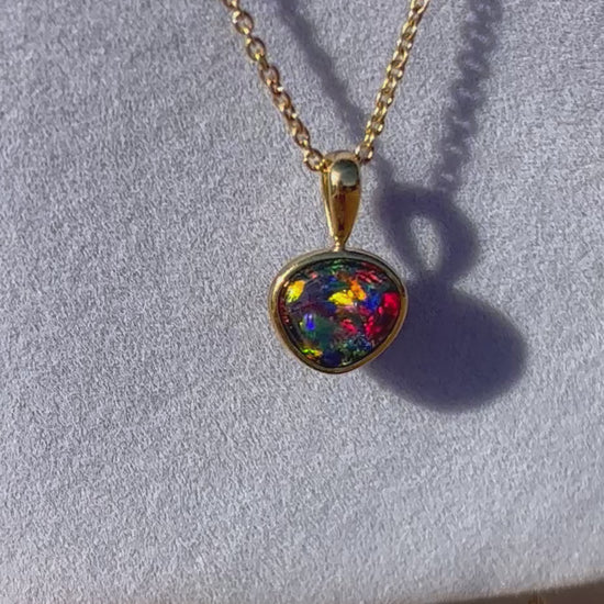 This 9k pendant features a beautiful triplet opal with colours of red, pink, orange and yellow with undertones of dark blues and unique pattern throughout the stone. 9k chain included with pendant.