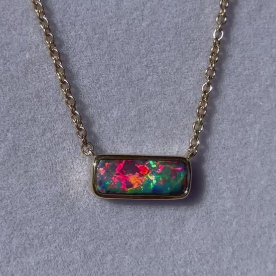 This 14k gold necklace features a beautiful doublet opal with all colours of the rainbow, but it is the neon pink that really catches the eye. Necklace is 18 inch and can be adjusted to 16 and 17 inch.