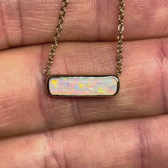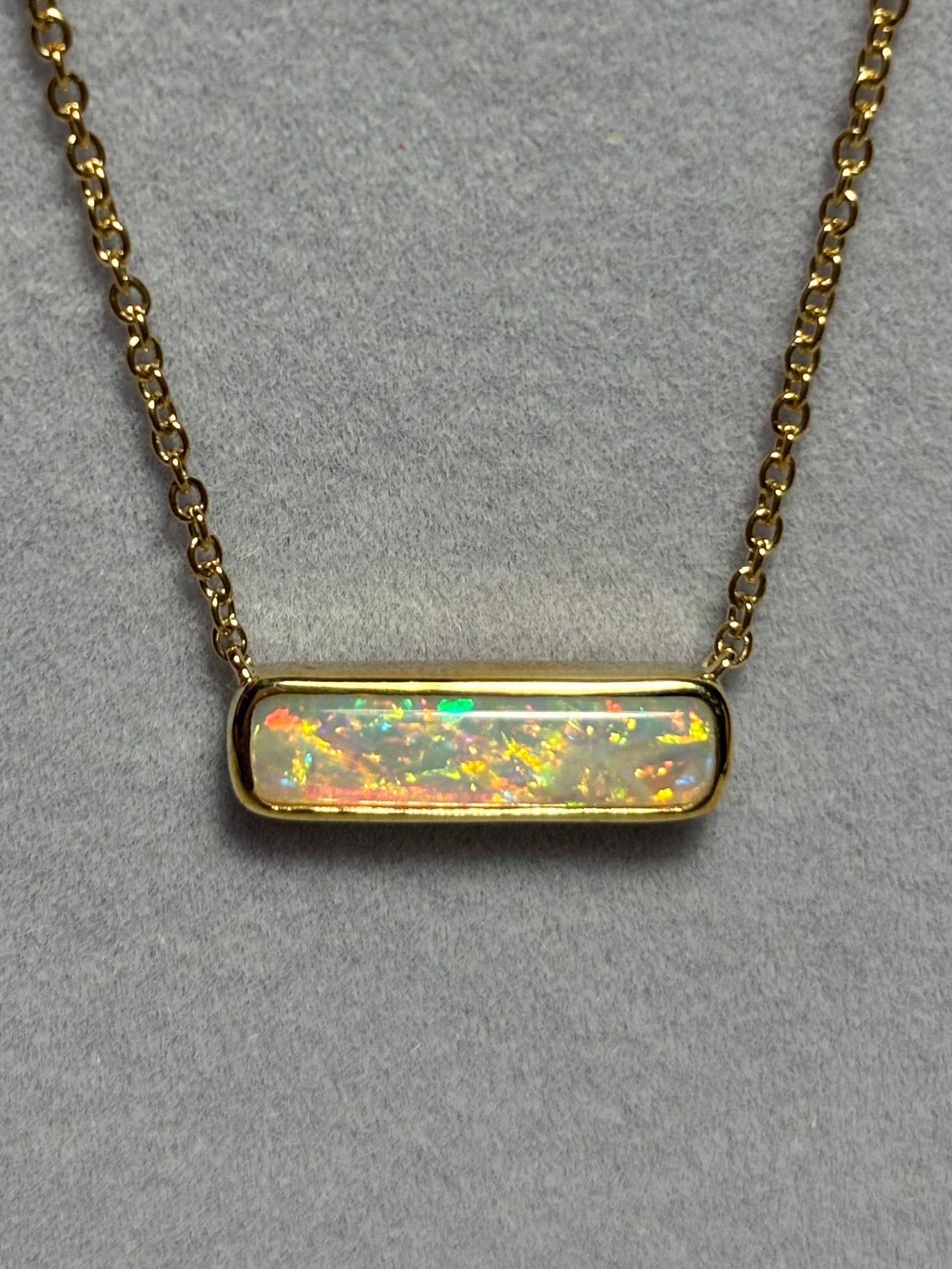 This 9k gold necklace features a beautiful crystal opal with all colours of the rainbow that flash and speckle from every angle. Necklace is 18 inch and can be adjusted to 16 and 17 inch.