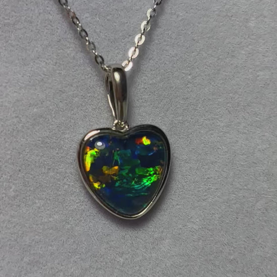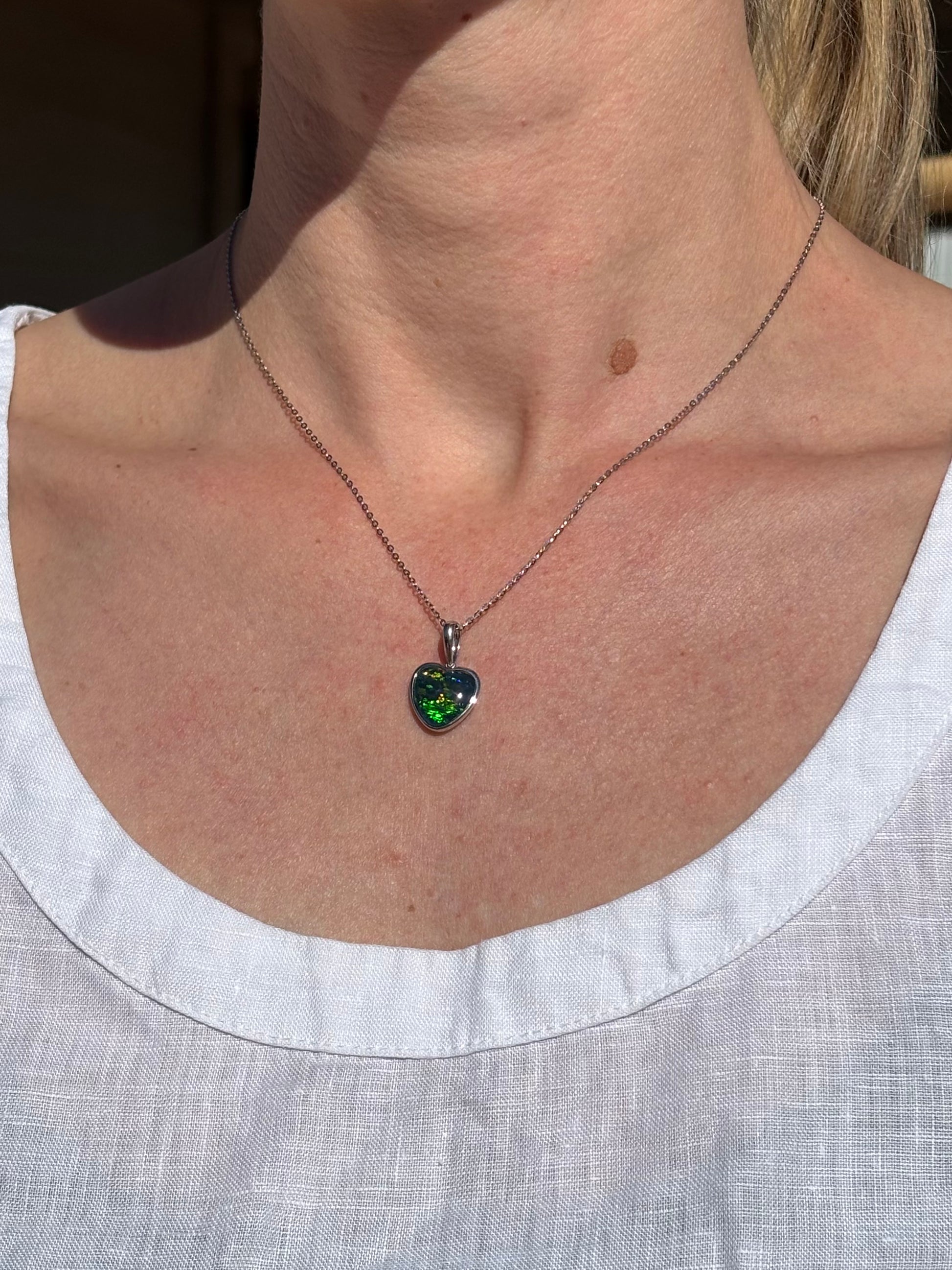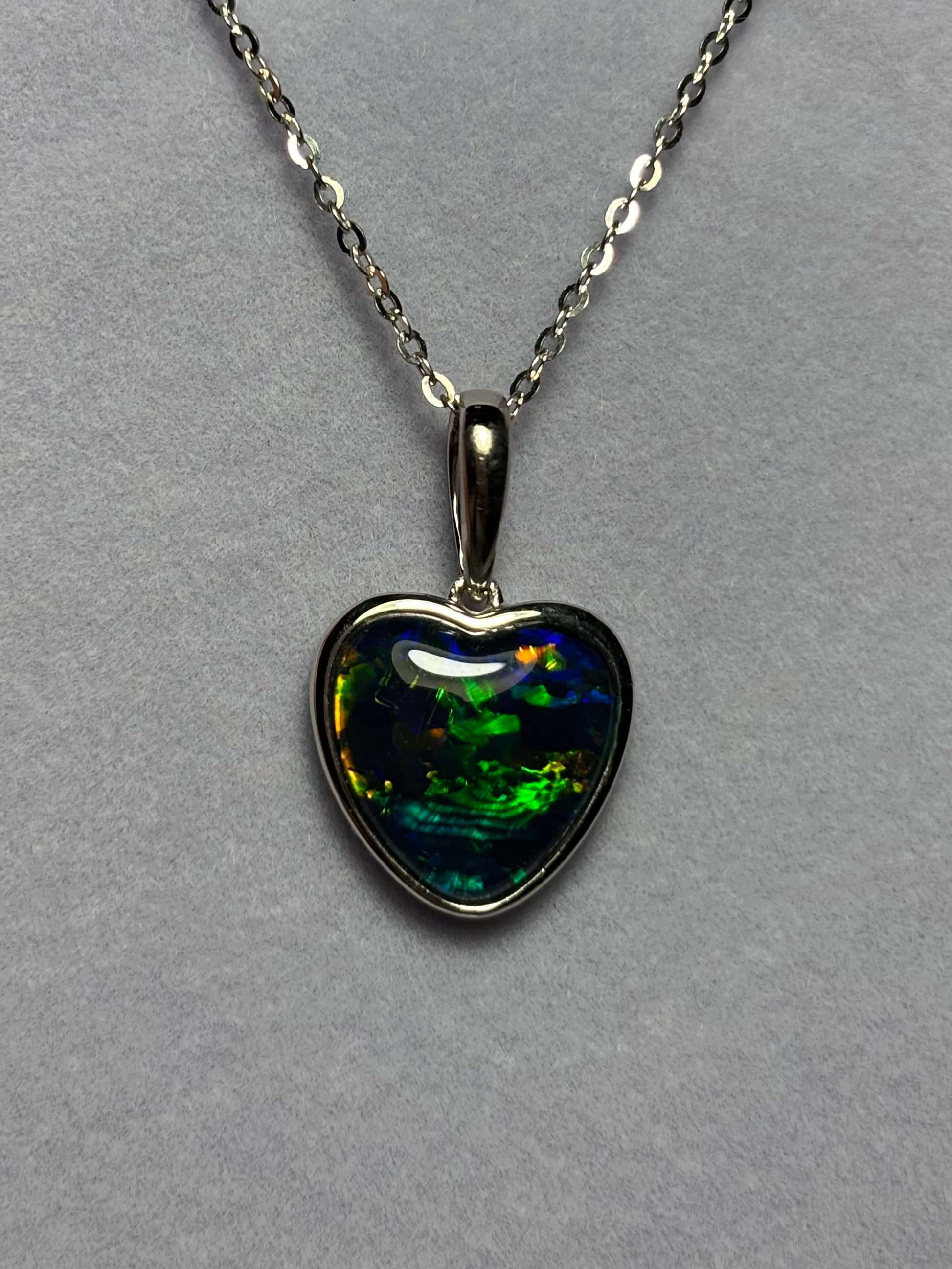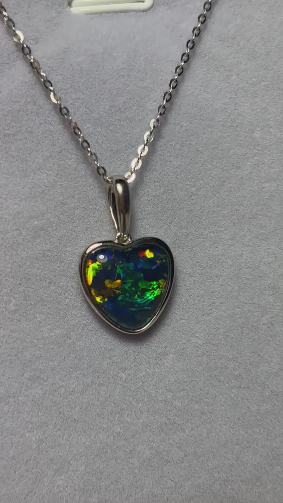 This sterling silver pendant features a beautiful triplet opal with colours of green, blue, orange and a unique pattern throughout the stone. Sterling silver chain included with pendant.