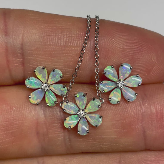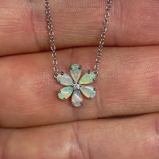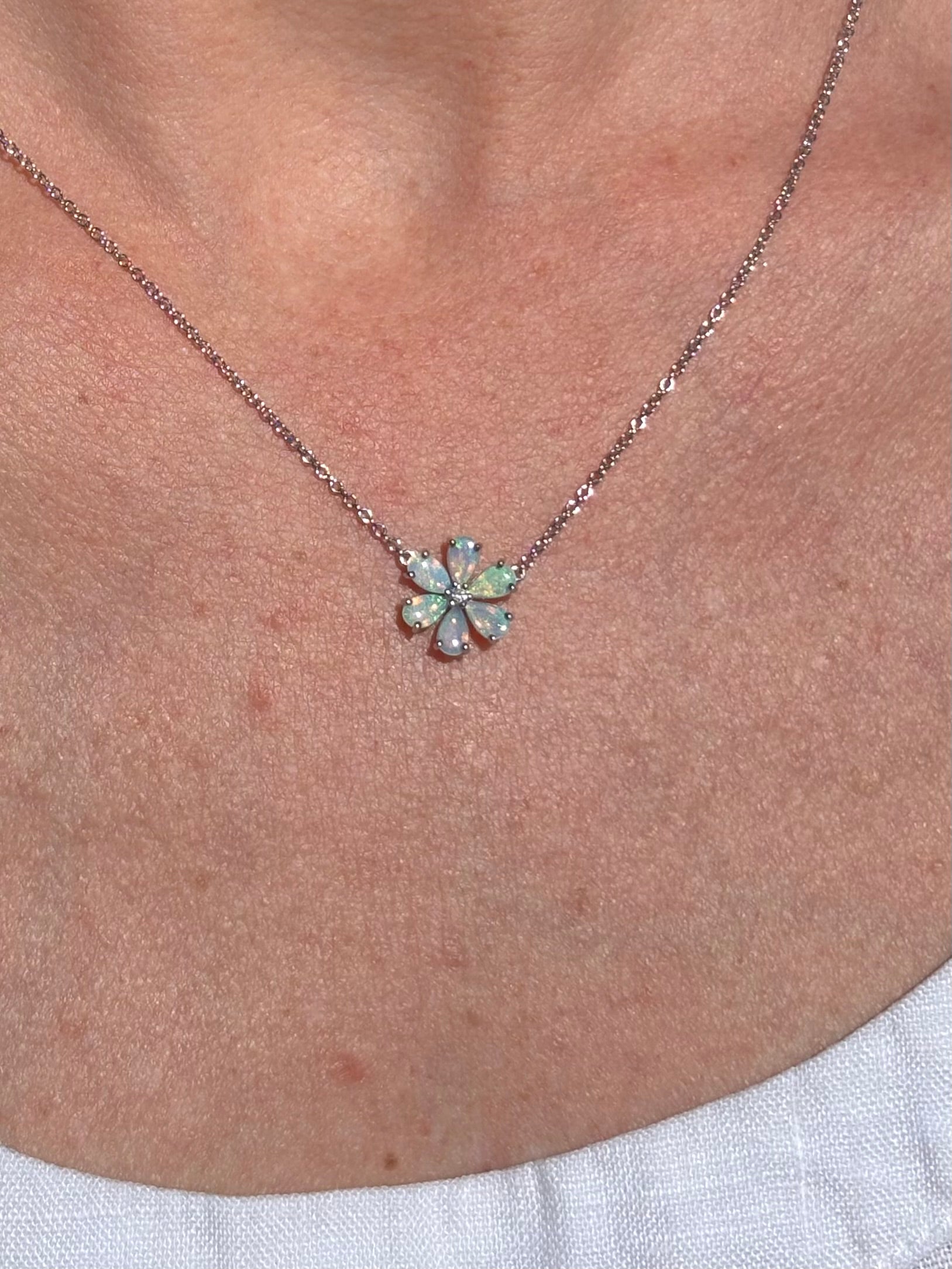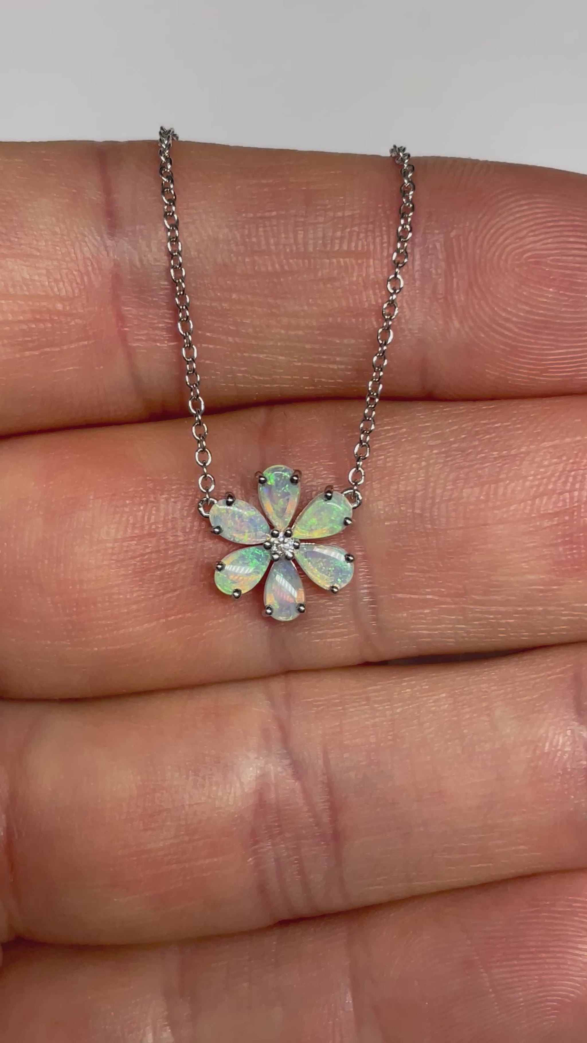 Necklace features 6 tear drop opals and white sapphire combined to create a gorgeous floral look.