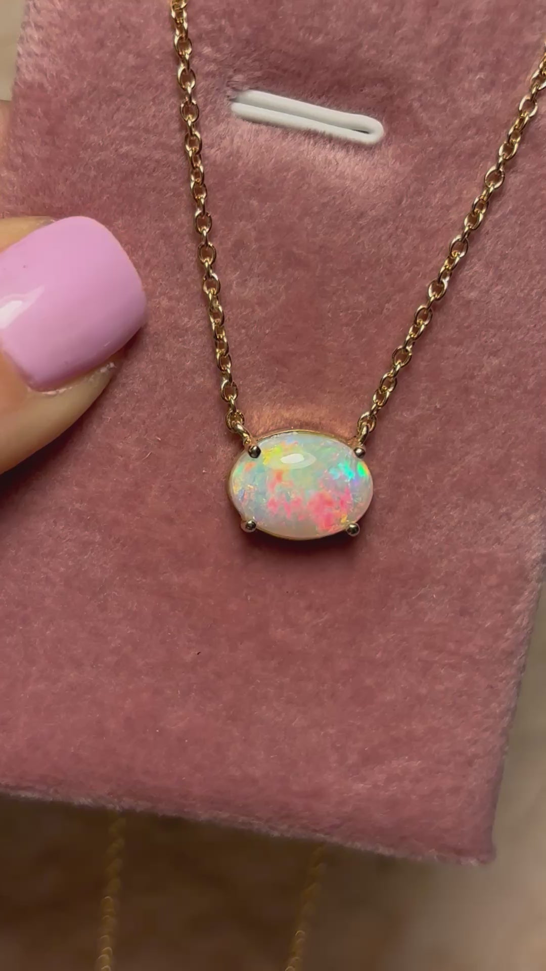 This 9k gold prong necklace features a beautiful white crystal opal with all colours of the rainbow, but the vibrant pink hues take the stage in this piece. Opal dances when light hits at any angle.
