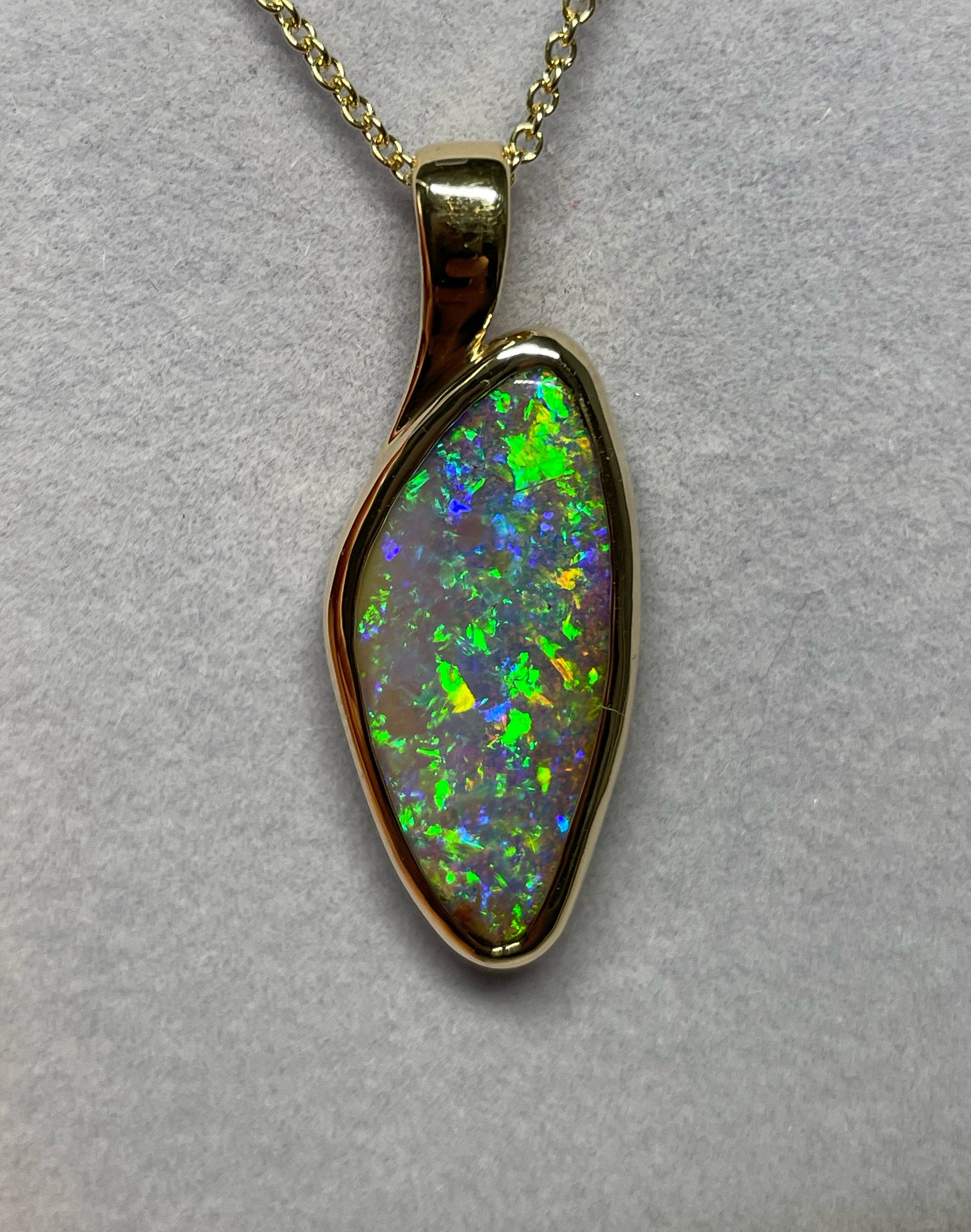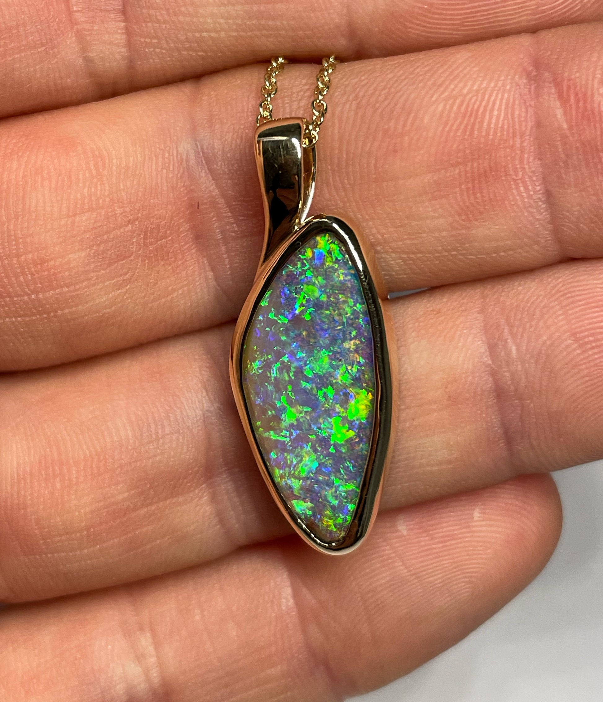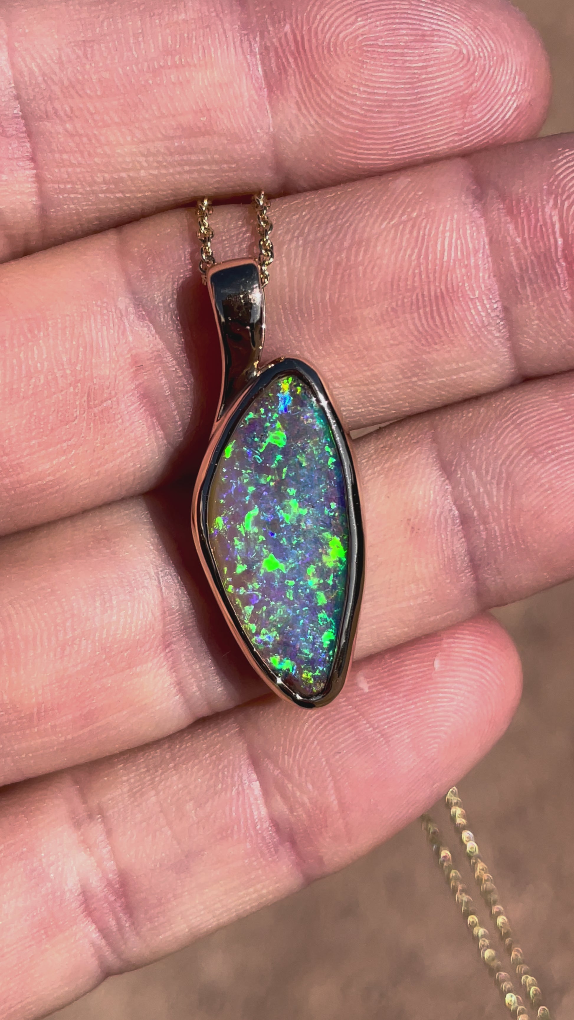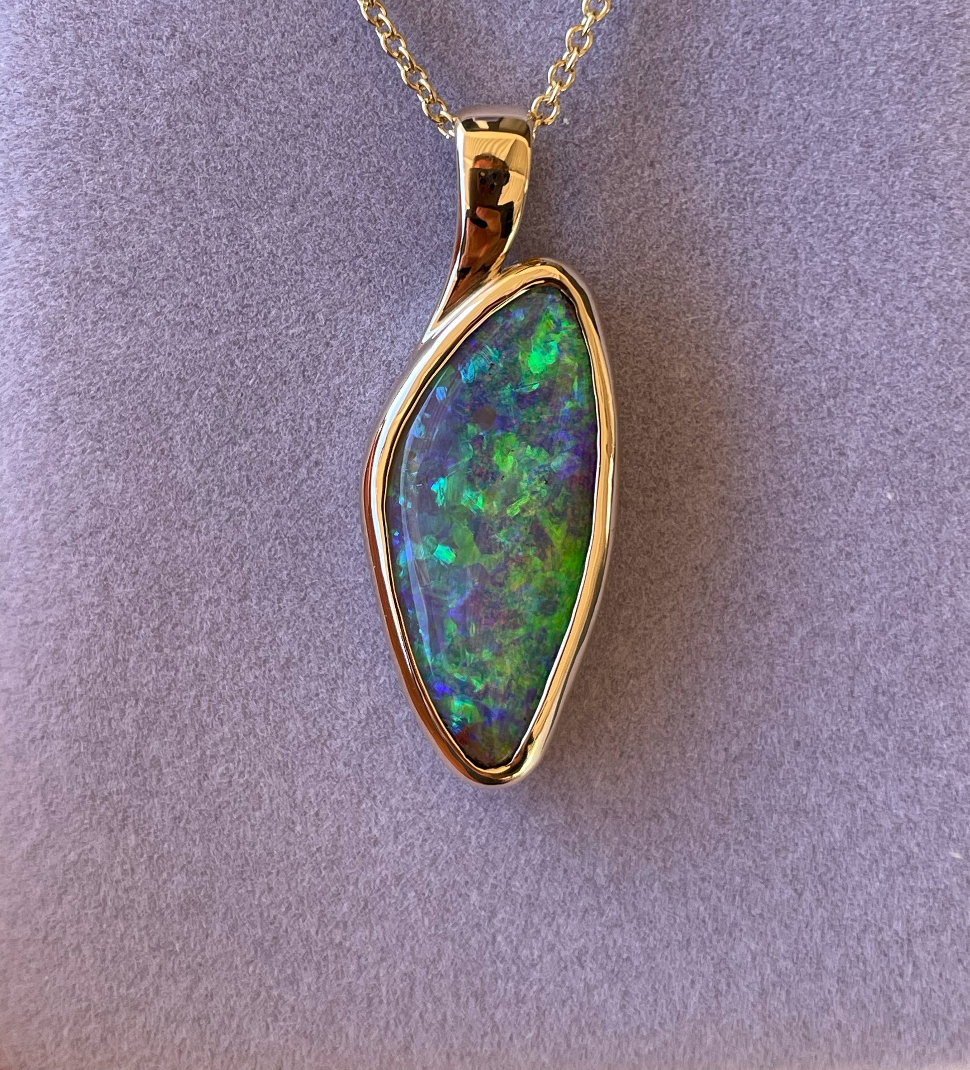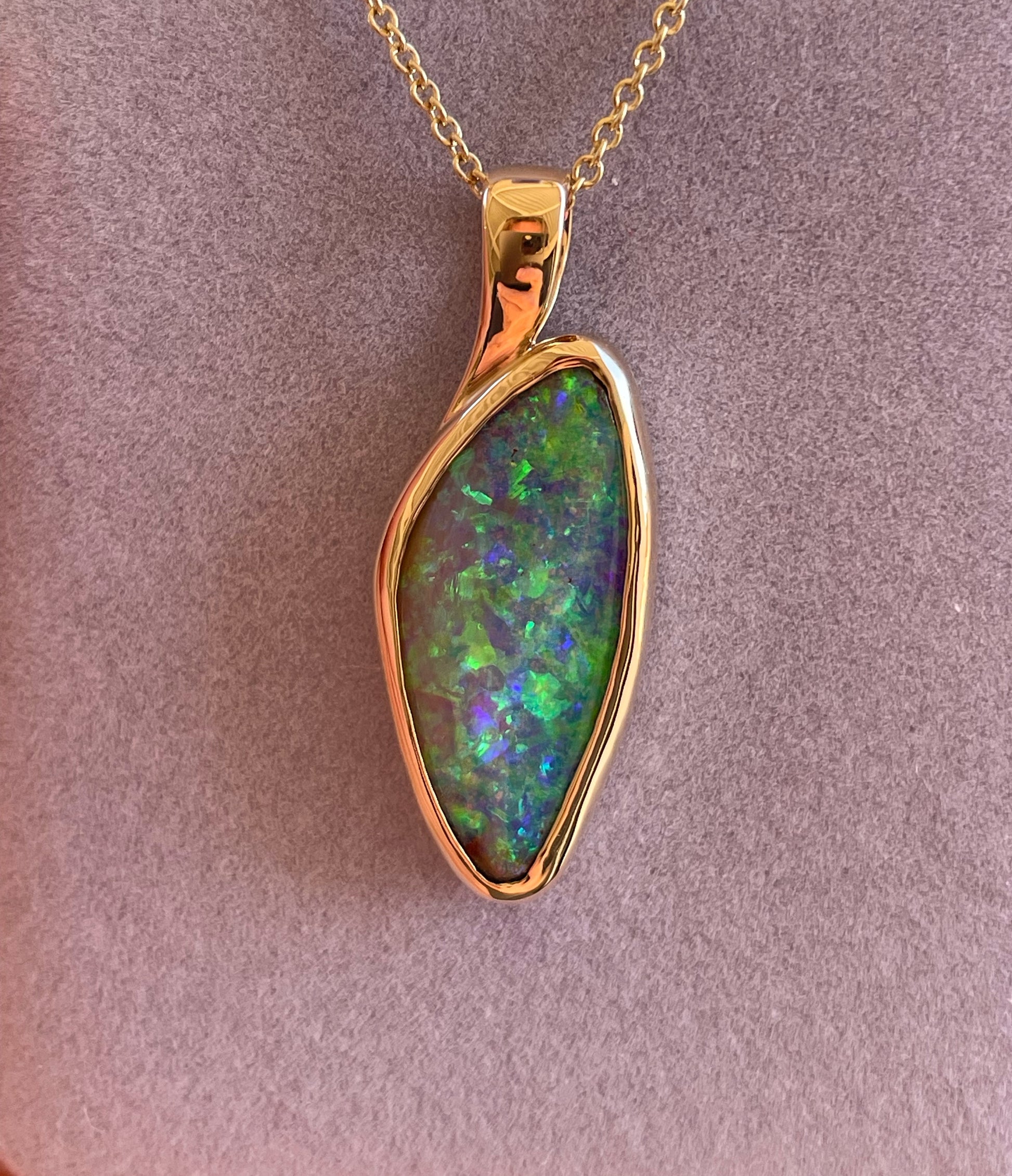 This features a remarkable boulder opal with vivid 3D green colour on colour with stunning kicks of gold/orange throughout that is lively in any light. Pendant includes a 14k gold chain.