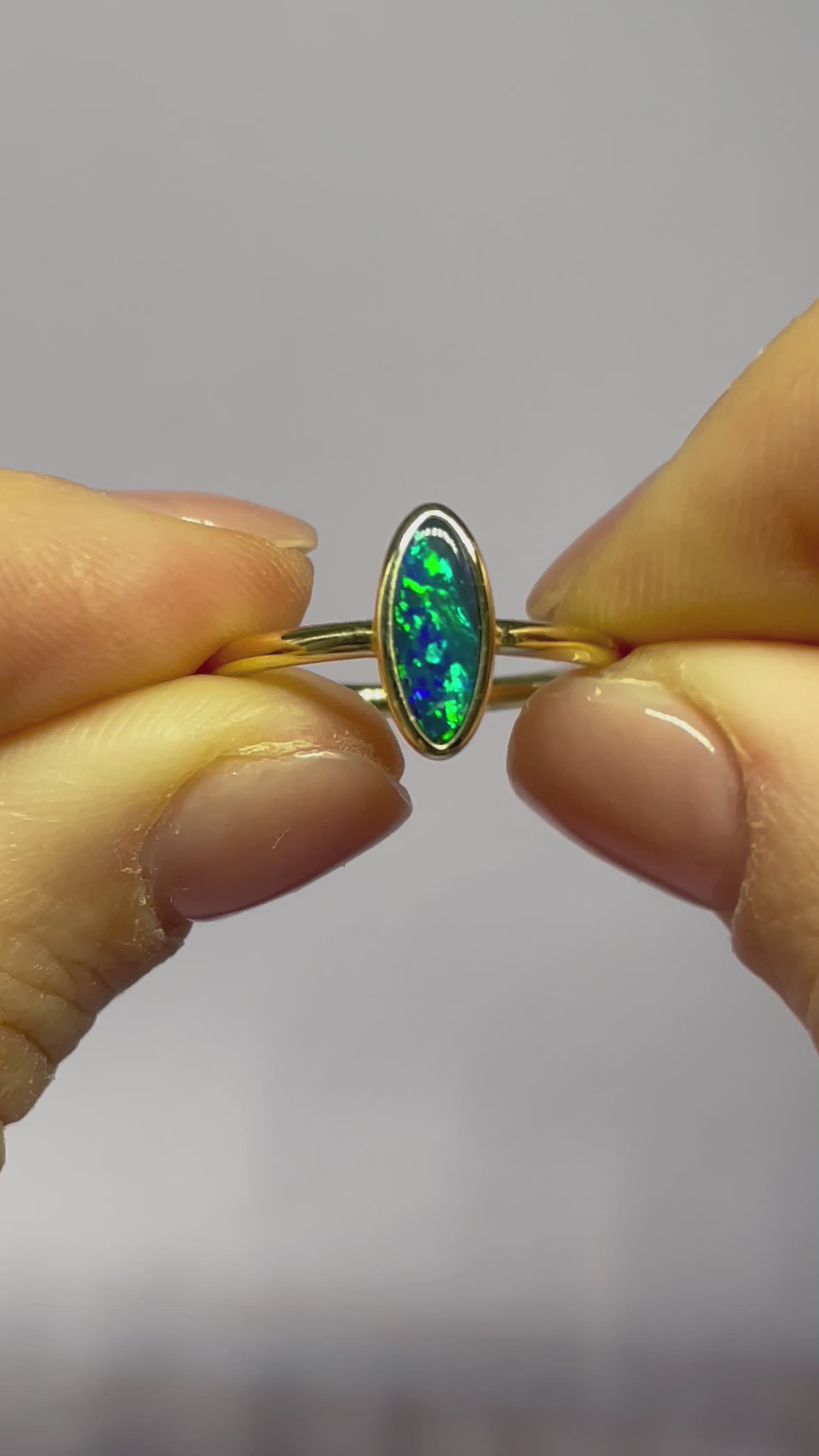 This 9k gold bezel set ring features a beautiful opal doublet with dominant colours of blue, green and teal. Opal doublet has a unique marquise shape with a lovely pattern within the stone.