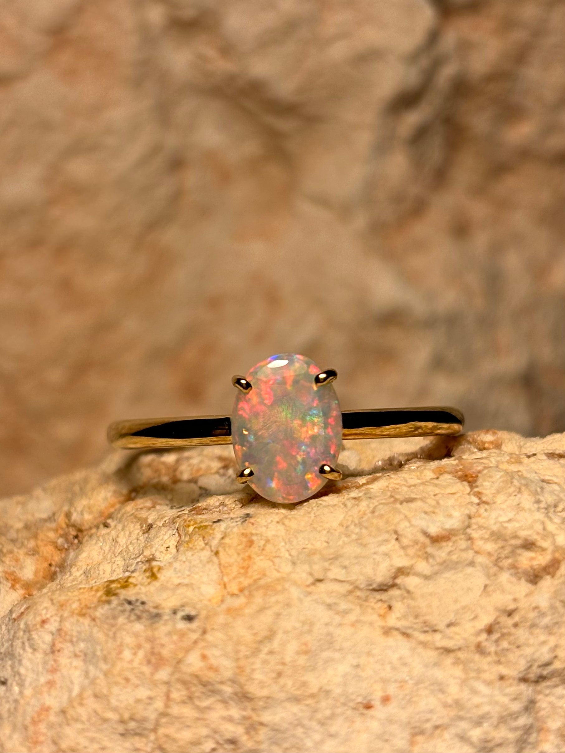This classic opal ring is from the heart of the Australian outback and was mined in at old dead horse field, Coober Pedy, South Australia. Our jewellery is all handmade and each opal is cut by us in our Coober Pedy workshop.