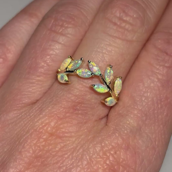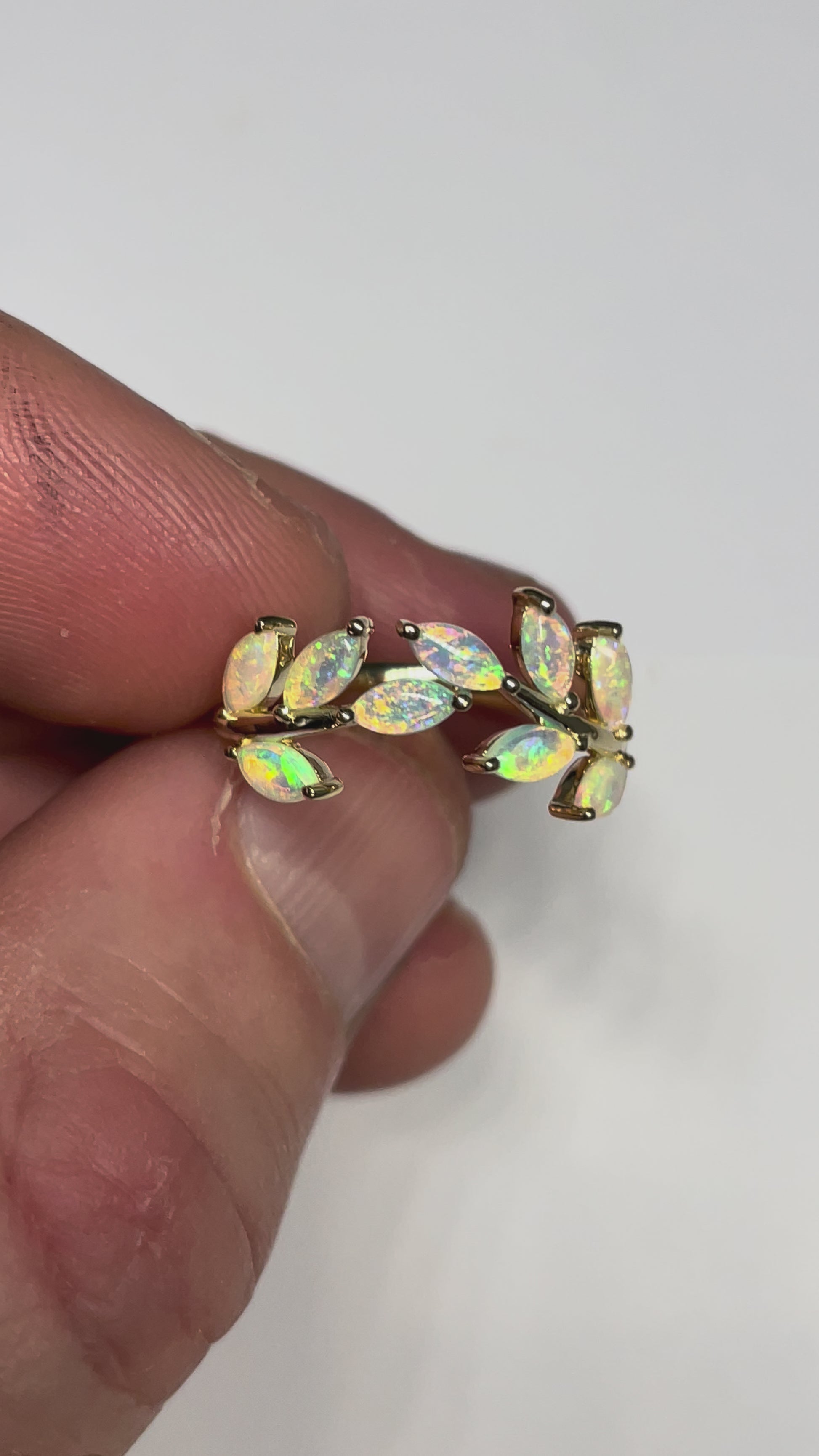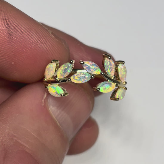 This classic opal ring is from the heart of the Australian outback and was mined in Coober Pedy, South Australia. This 9k gold opal vine ring features marquis cut crystal opal with vibrant colours of gold, green, and blue with fantastic brightness.