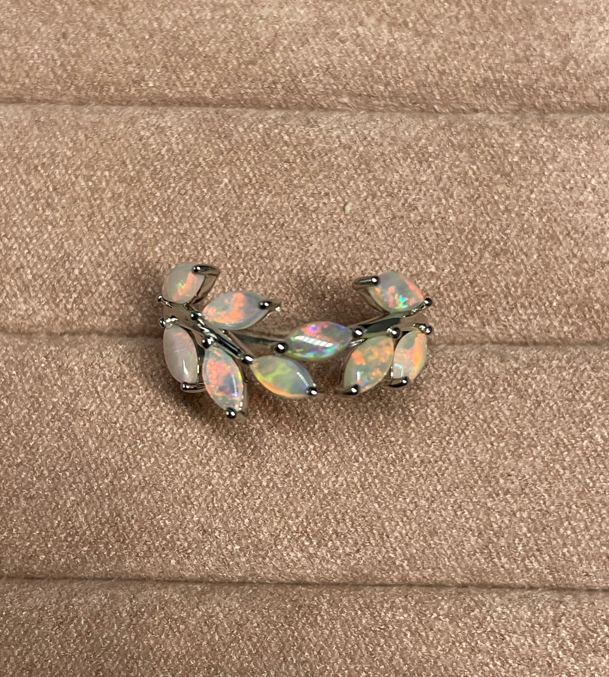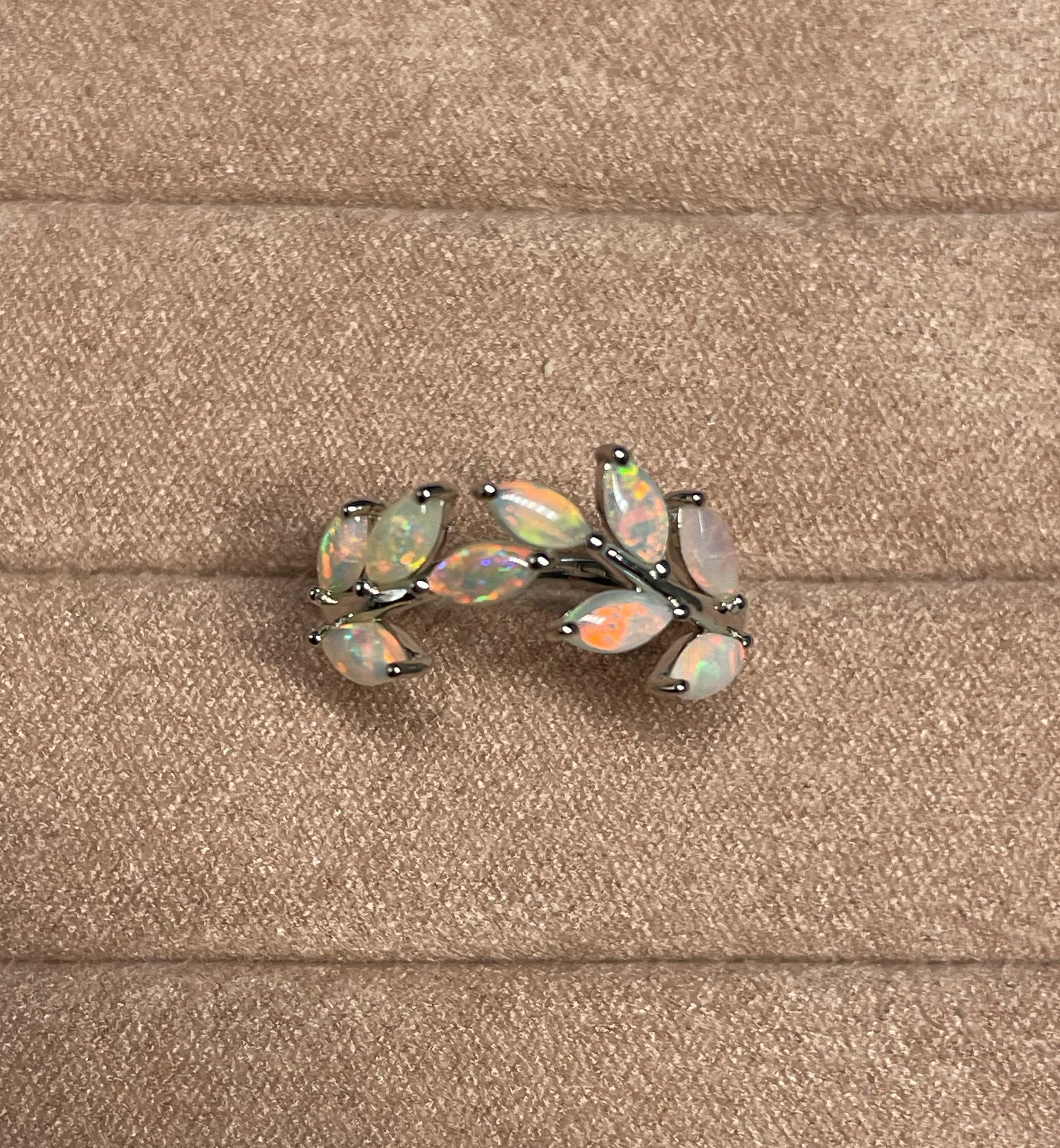 This sterling silver opal vine ring features marquis cut white opal that kicks colours of pink, purple and orange that dazzle from every angle.