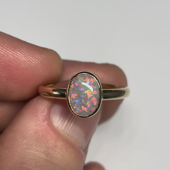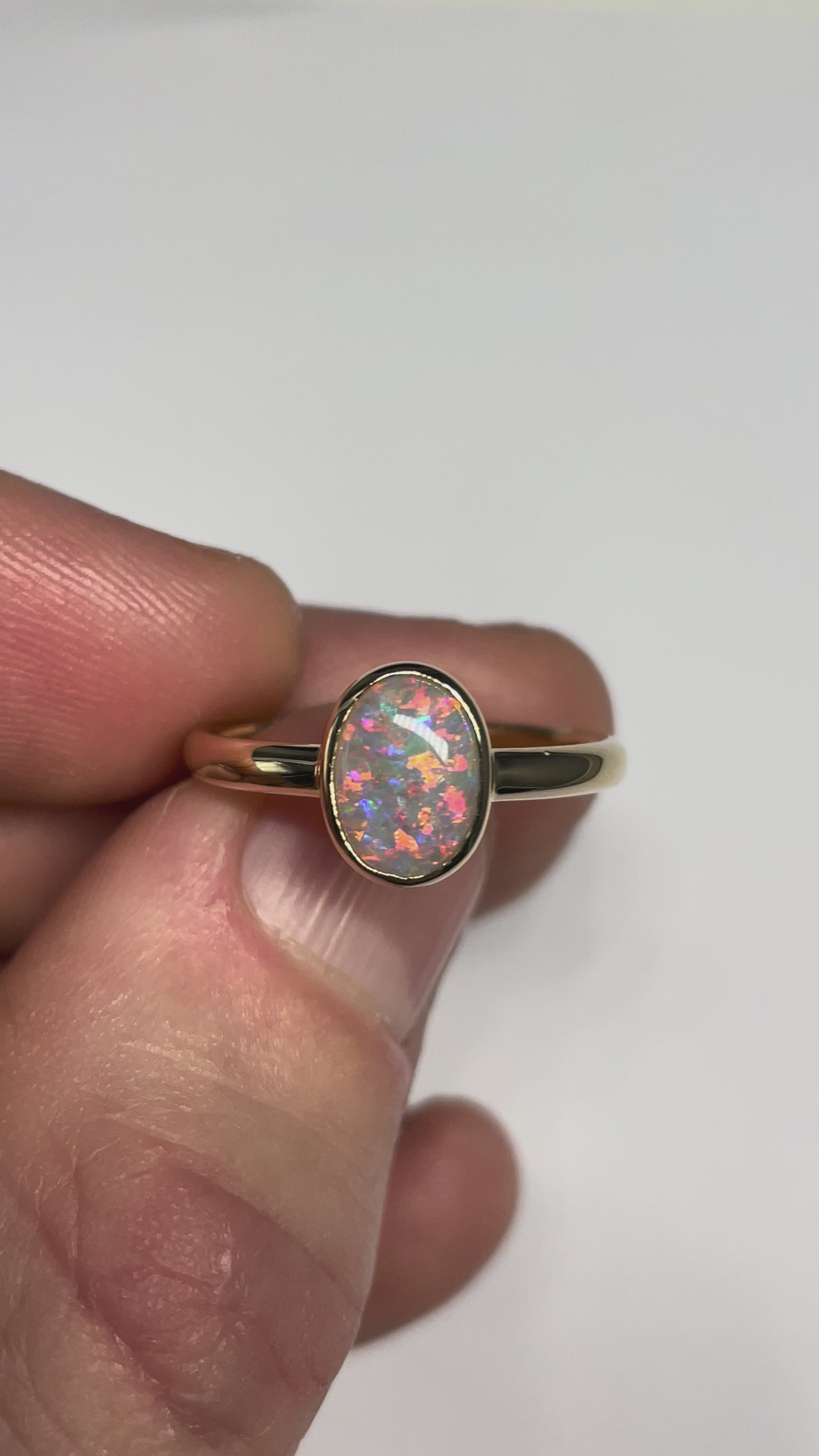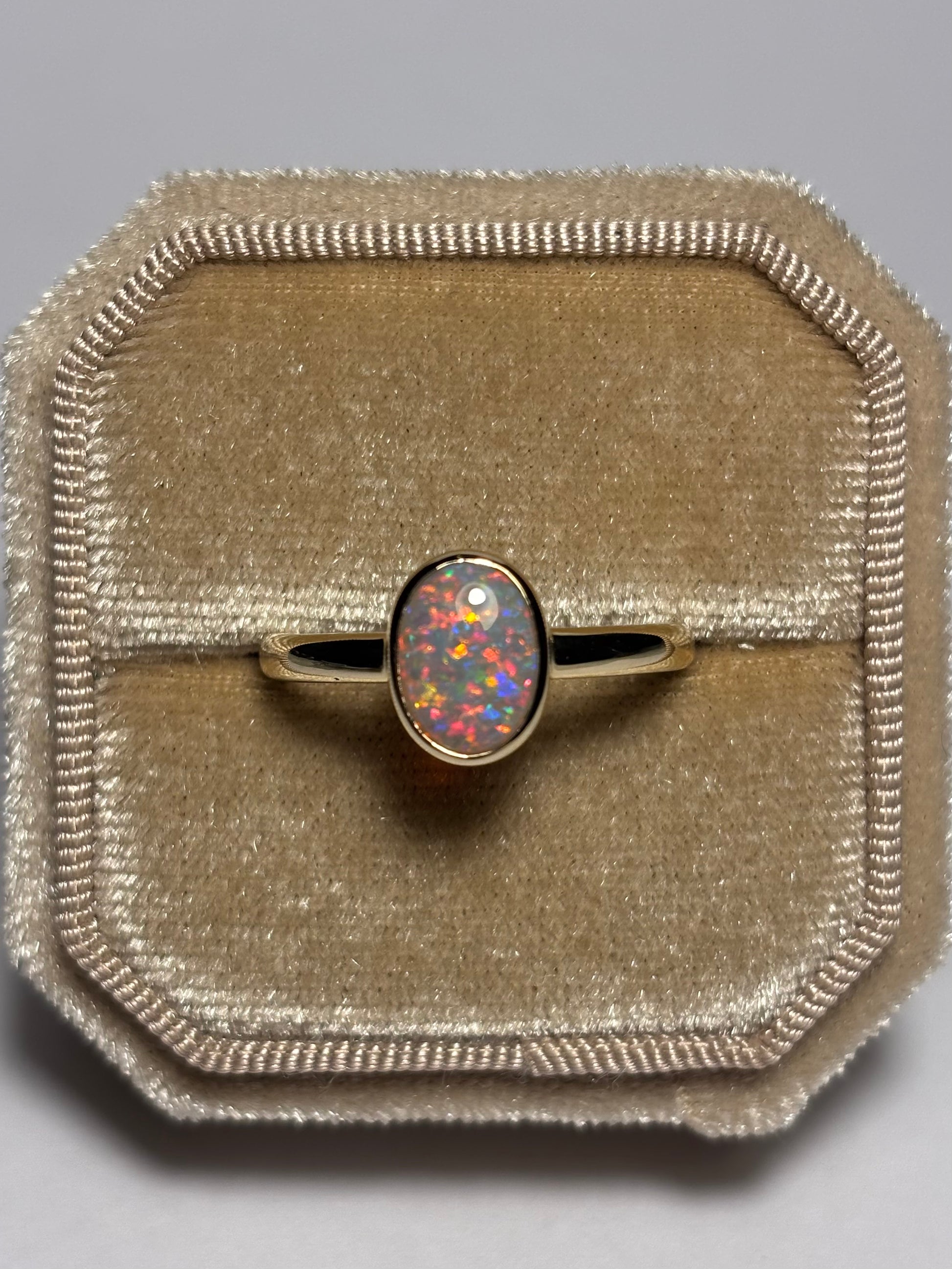 This 14k gold bezel ring features a beautiful dark opal that glitters all colours of the rainbow, but it is the vibrant pink that really catch the eye. Stone has a lovely confetti pattern throughout.