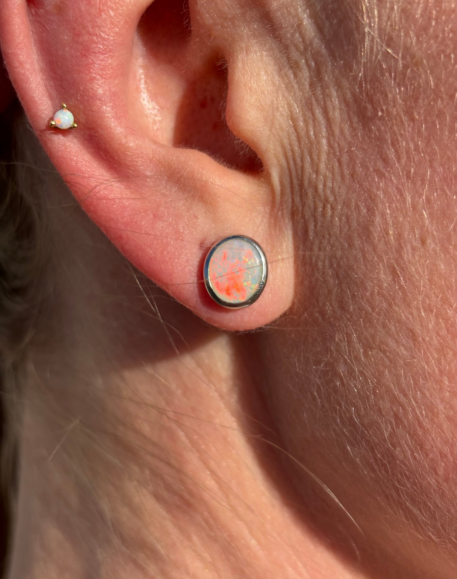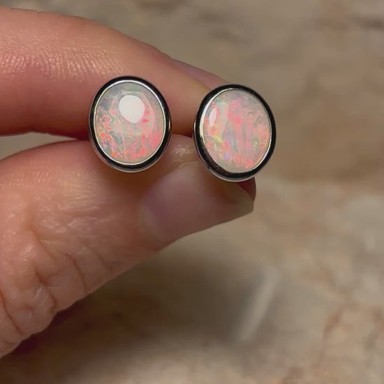 These sterling silver stud earrings features beautiful, pearly white opals with flashing pinky-reds throughout.