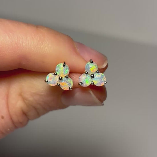 They feature a trio of 3mm round crystal opals with vibrant colours of green, gold, blue and orange and are very electric.
