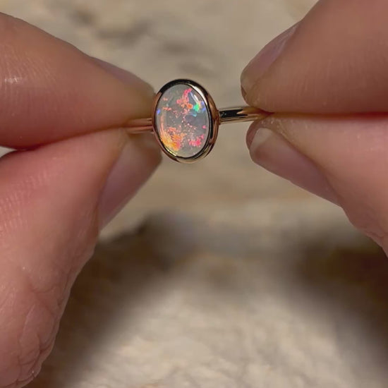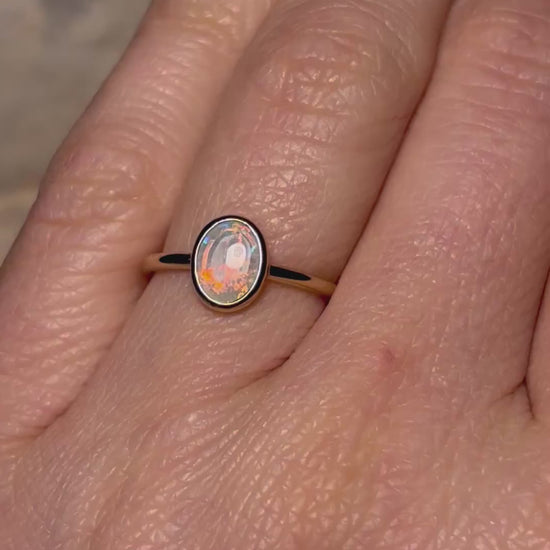 This 9k ring features a pretty crystal opal with colours of pink, orange and peach that sparkles anytime light hits the stone.