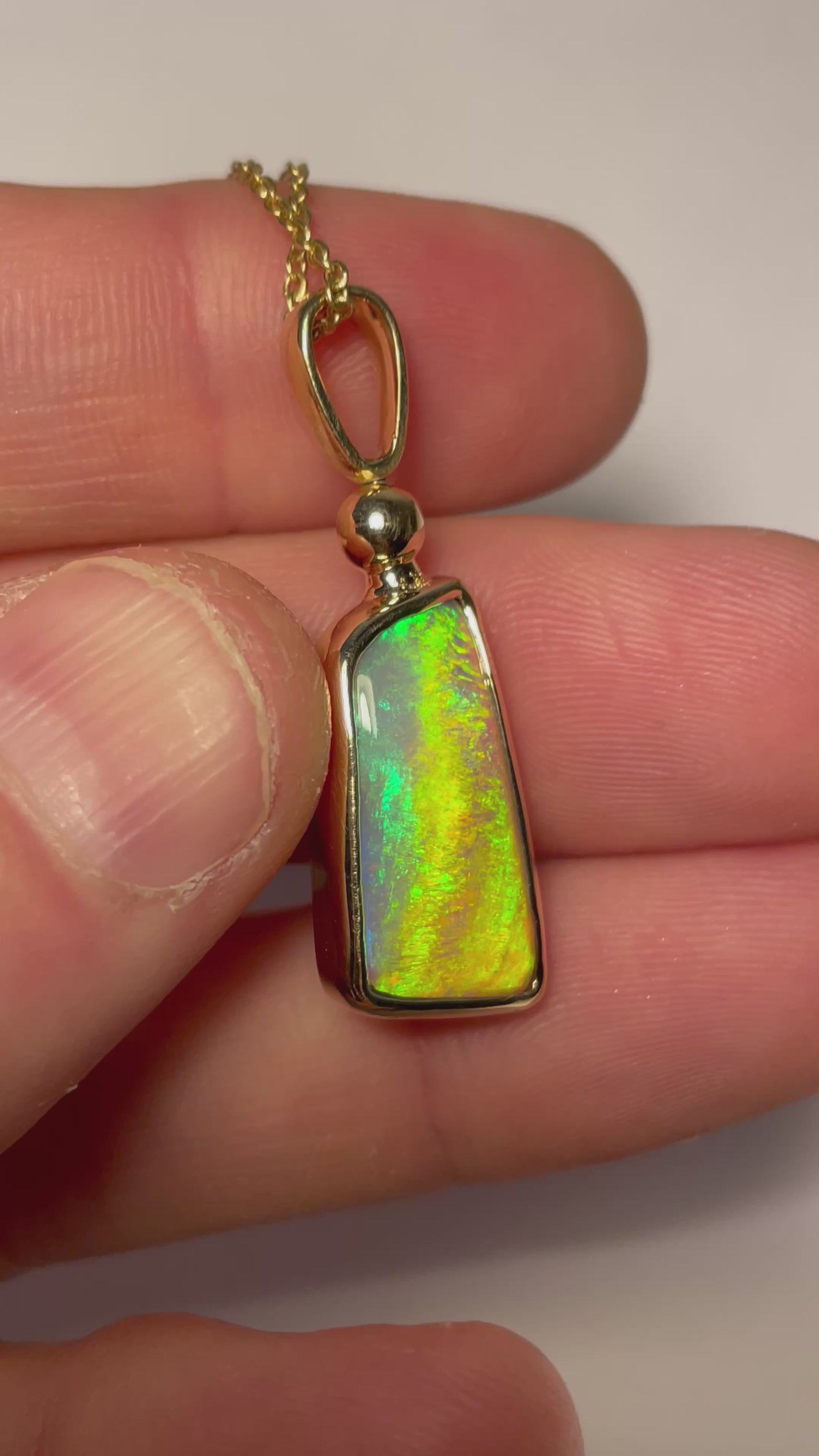 This 14k gold pendant features a beautiful crystal opal that has 360 degrees of rolling flash. This pendant has been made with a spinning bail to showcase all of its bright colours and is a great piece for those who love to play with their jewellery! Gold chain included with the pendant.