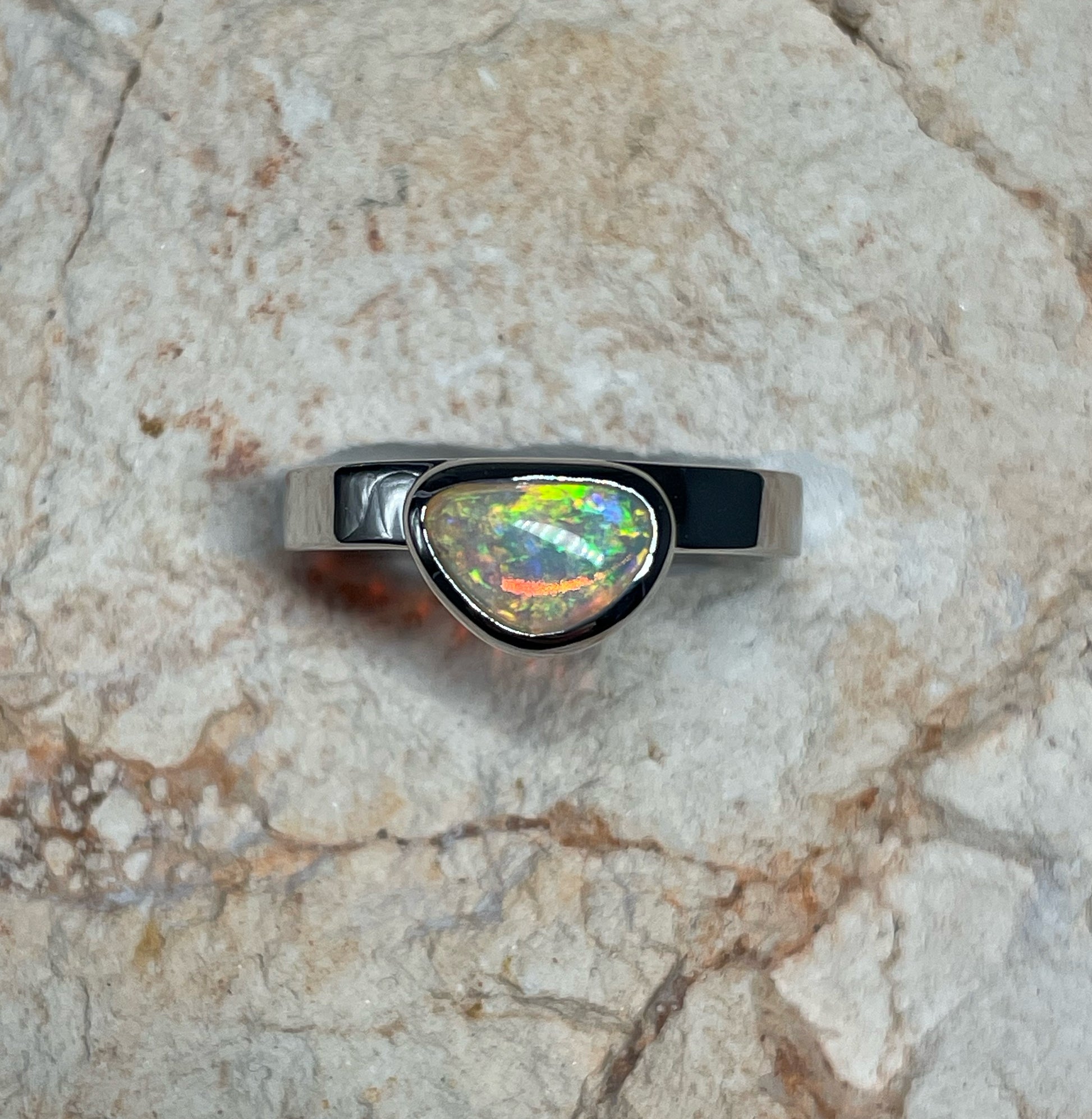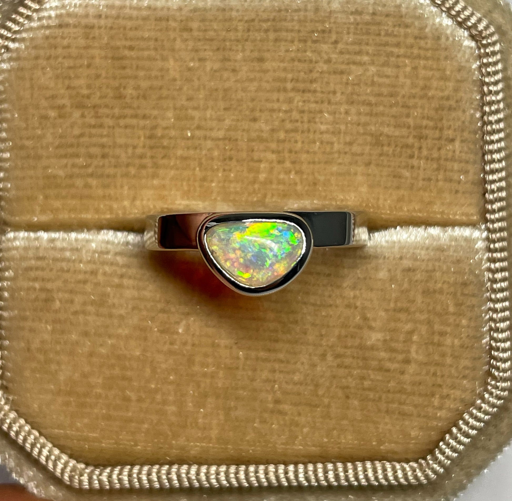 This classic opal ring is from the heart of the Australian outback and was mined at the Turkey Ridge field, Coober Pedy, South Australia. Our jewellery is all handmade and each opal is cut by us in our Coober Pedy workshop.